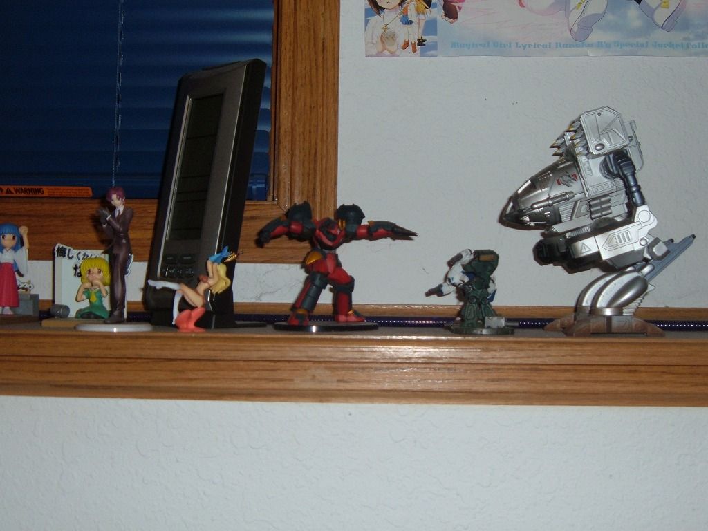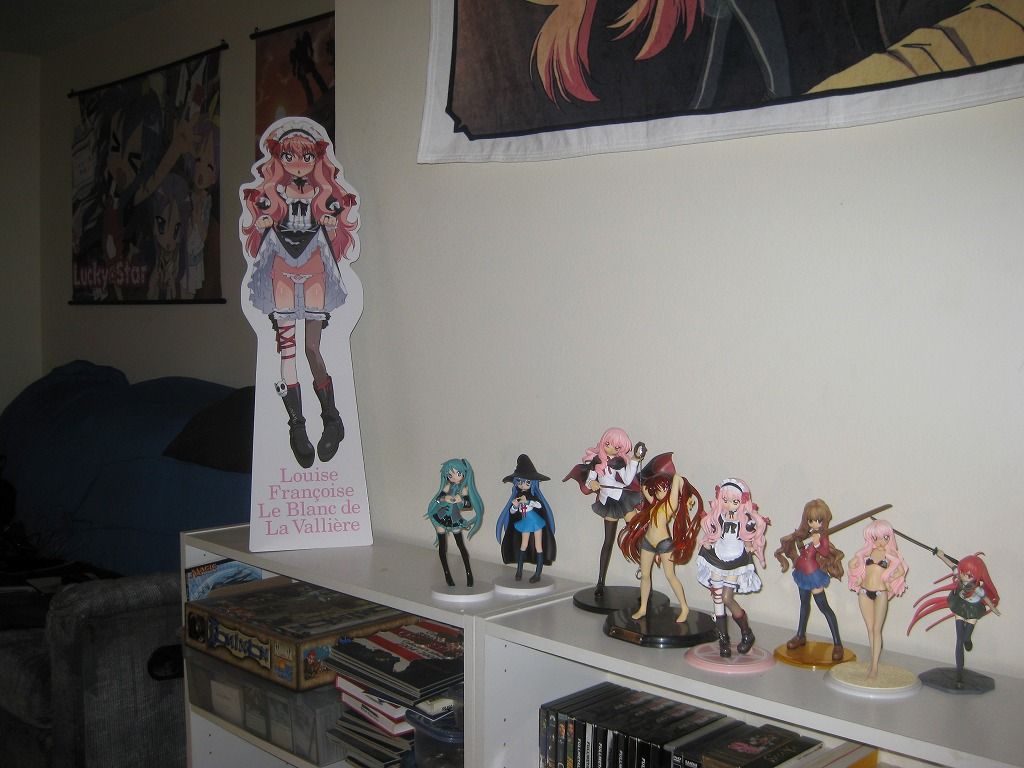 本棚にずら~と日本アニメのフィギュアが飾られてる。